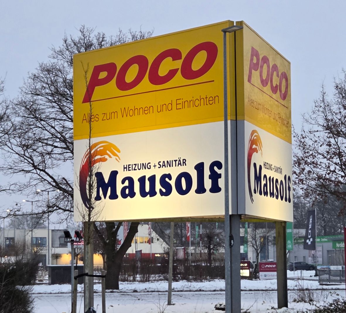 Es wurden in Delmenhorst die Werbetafeln an einem Werbeturm für die Firma Mausolf Heizung & Sanitär erneuert.